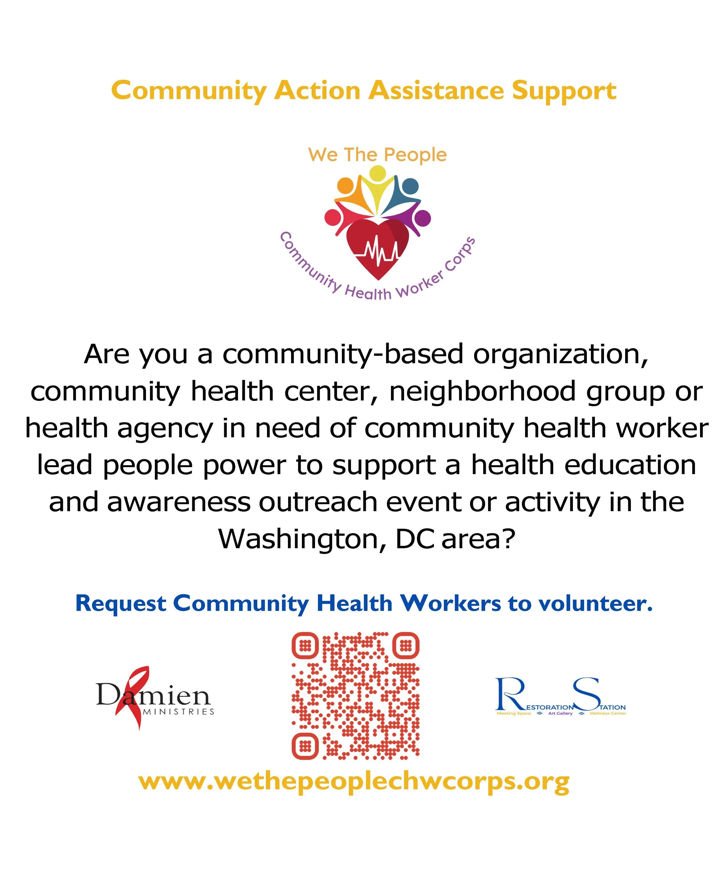 We the People Community Health Worker Corps @ Damien Ministries is excited to offer support to community organizations, health agencies, neighborhood associations, and other groups who need person power to launch, scale or implement a community health education and awareness project program or event.